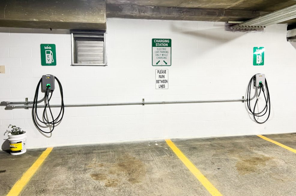 Level-2 chargers located inside the garage for electric vehicle owners.